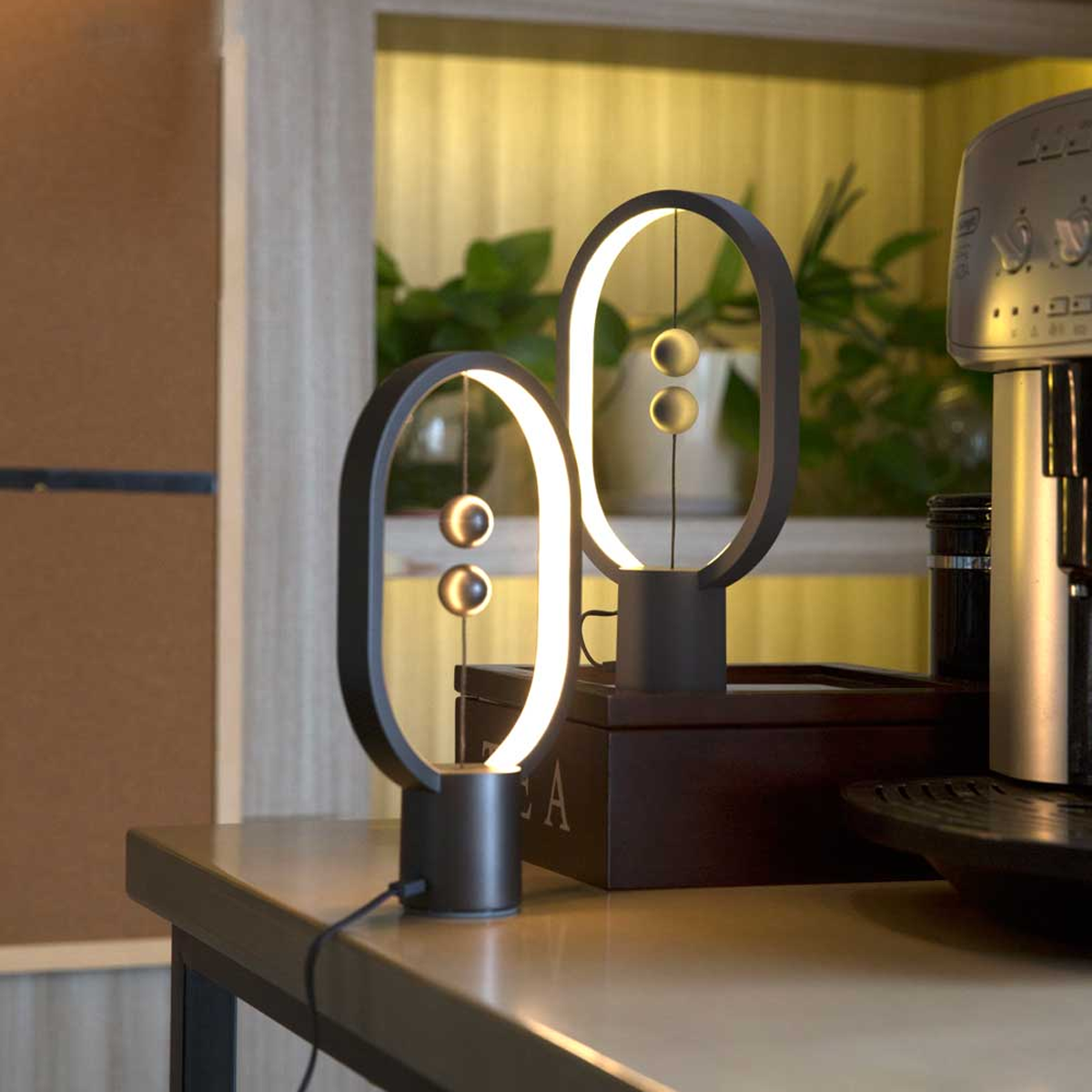 lift the lower ball attached to a cord, it attracts to the top one through the embedded magnets inside creating a connection that switches on the lamp's LED light.
